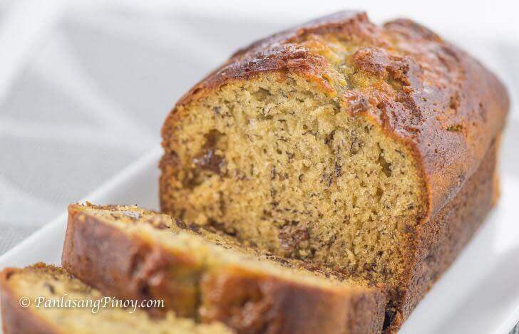 You can use a Pyrex loaf pan (like what I did), or any regular aluminum or metal loaf pan that you have available when baking the banana bread– it does not matter. However, since not all ovens work the same, I suggest that you check if your moist banana bread with raisins is done within 45 minutes of baking using the toothpick test. Simply stick a piece of toothpick into your banana bread and pull it out completely. If it comes out clean, then you can remove the bread from the oven. Otherwise, continue to bake until the bread is completely done.