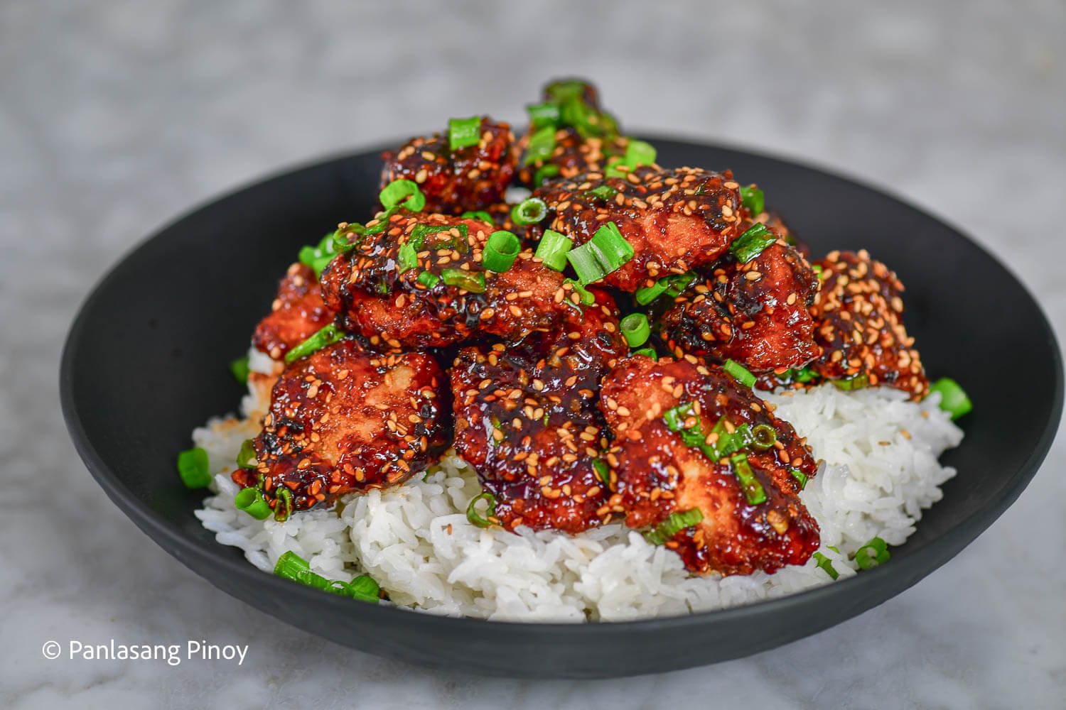 - Arrange the sticky crispy fried chicken on a serving plate. Sprinkle sesame seeds on top and garnish with chopped green onions. Serve with warm white rice. Share and enjoy!2 tablespoons toasted sesame seeds, 1/4 cup green onions