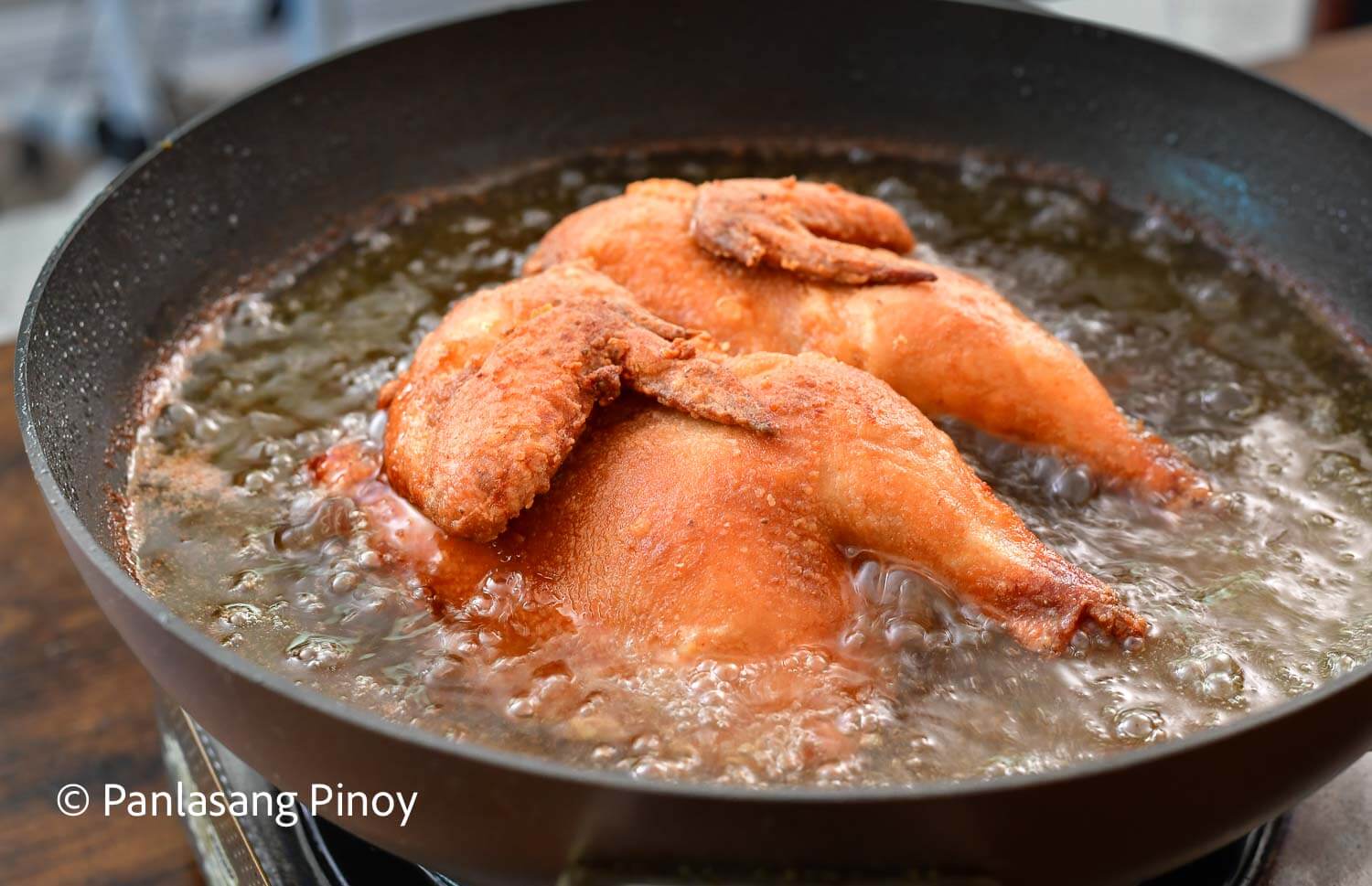 - Remove the Filipino fried chicken from the wok. Place it over a wire rack to cool down. (See notes below)2