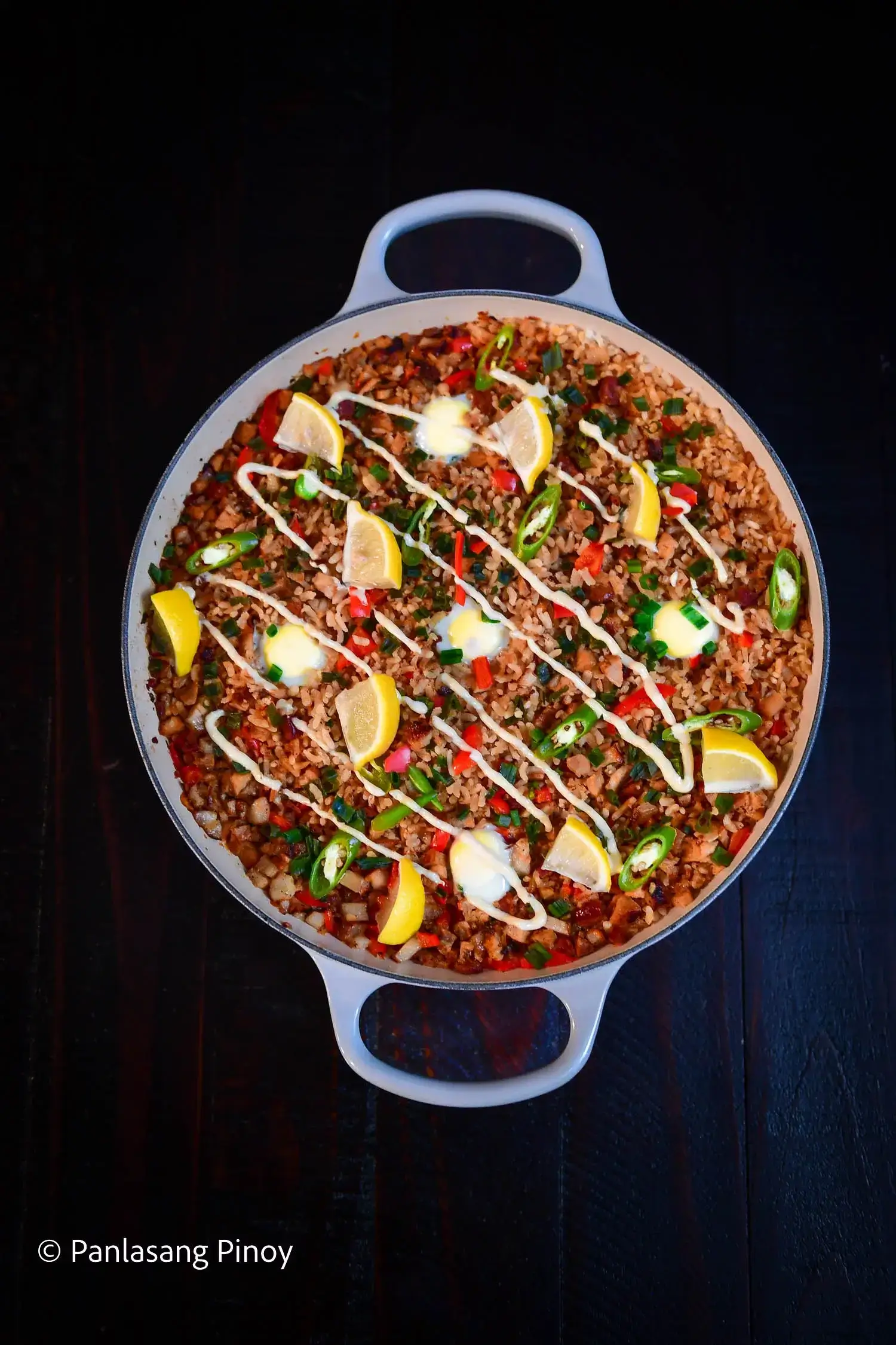 - Combine the dressing ingredients and drizzle over the sisig paella. Serve with lemon wedges.